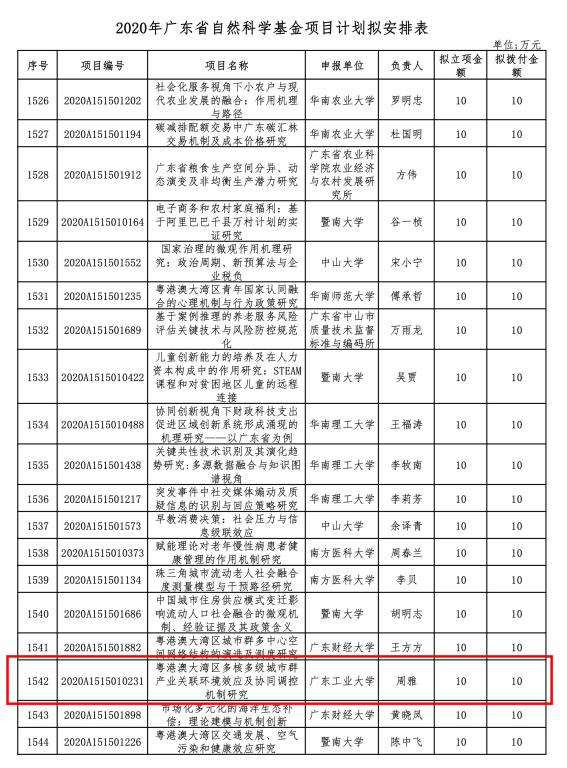 2月24日,广东省科技厅公示了2020年度省科技创新战略专项资金(广东省自然科学基金等)拟立项项目(公示期2020年2月24-3月1日)。51暗网 周雅副教授申报的“粤港澳大湾区多核多级城市群产业关联环境效应及协同调控机制研究”获得面上项目资助,这是51暗网 2020年首次获资助的科研项目