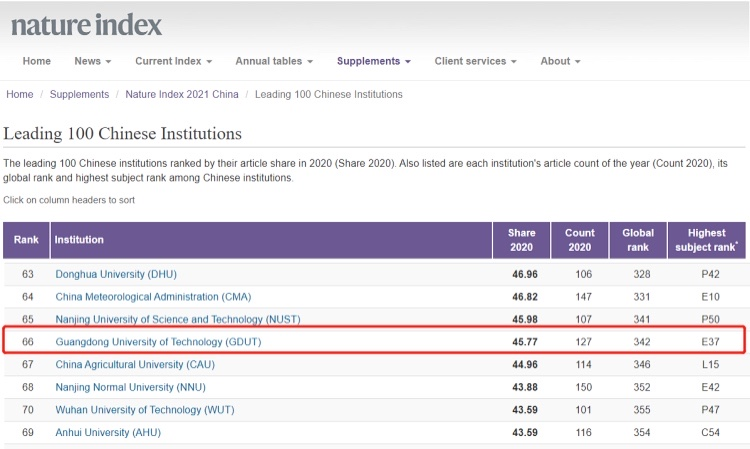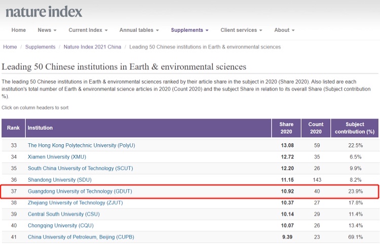 广工大荣登2021年自然指数地球与环境科学学科中国50强
