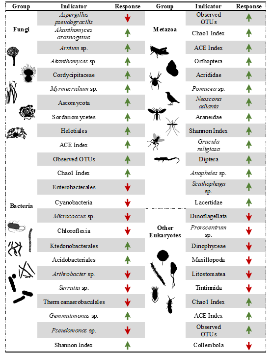 表1.与土壤理化变量显著相关的生物指标。绿色箭头表示正相关,红色箭头表示负相关。