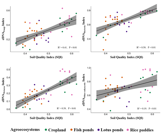 研究基于eDNA技术监测了嘉善典型农业生态系统的土壤生物多样性,联合理化性质筛选敏感性生物指标,构建eDNA指数评价体系并与SQI指数对比后发现:eDNA指数与SQI指数具有显著的相关性,这一发现说明基于生物指标的eDNA指数具有评价土壤生态健康的能力,凸显了eDNA技术在未来土壤健康研究领域中的潜力。
