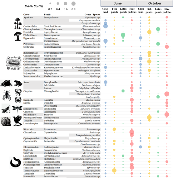 图2.监测的属或种在不同农业生态系统和季节的相对丰度存在显著差异。气泡大小表示该物种在所有土壤样品中监测到的属或种的百分比。