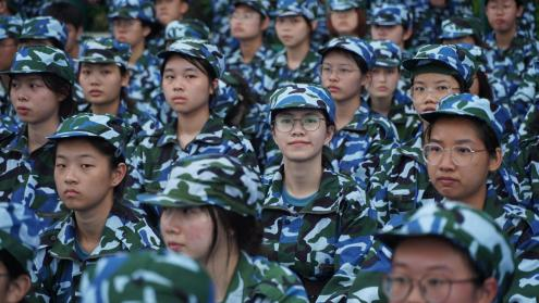 新生正展示他们专属的青春风采。伴随着一声响亮的“稍息、立正”,分列式、军体拳与持枪方队正有条不紊地进行着训练。
