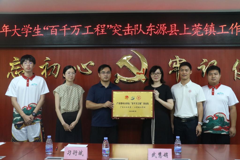 师生赴河源市东源县上莞镇调研交流,同时举行“百千万工程”突击队工作站揭牌仪式。学院党委副书记武慧娟,学院团委书记刁衍斌,辅导员欧少珍,团东源县委副书记李铸,上莞镇副镇长兼团委书记朱瑾璟,赴上莞镇“碧水清乡”服务队全体成员等参加活动。