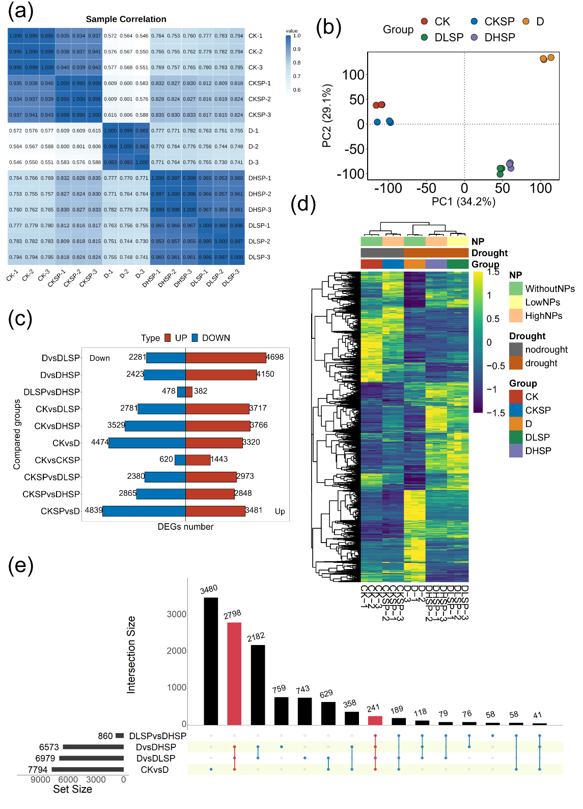 图2.水稻地上部转录组图。(a)样本间相关性。(b)基因表达的PLS_DA模型得分图。(c)比较组中的差异基因数量。(d)所有差异基因的聚类热图。(e)四个比较组中差异基因的upset图。