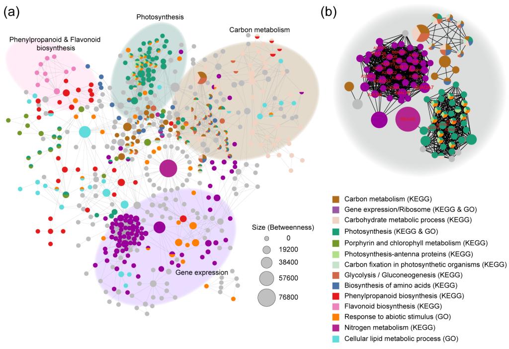 图3.响应干旱和叶面喷洒纳米氧化铈处理的差异基因互作网络。(a)542个差异基因的完整互作网络。(b)按Hubba分级排序的前100个差异基因互作网络。