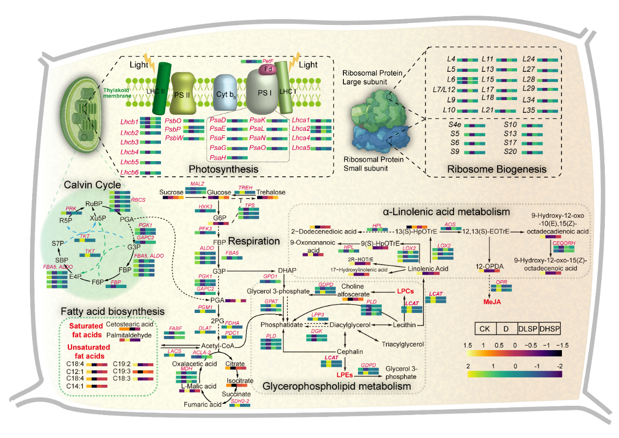 研究结果表明,长期中度干旱导致水稻地上部ROS、丙二醛、脱落酸和茉莉酸甲酯(MeJA)过度积累,并下调光合作用相关基因表达,导致水稻株高和生物量分别降低14.99%和57.42%。但叶面喷施纳米氧化铈能提高干旱下的水稻生物量和根冠比。叶面喷施CeO2NPs导致水稻叶片中ROS、脱落酸的积累分别降低了47.65%、30.61%和63.32%。叶片ROS降低从而保持叶绿体结构完整性,脱落酸降低和光合气体交换增强提高了光合作用产量,最终使干旱胁迫下水稻株高和总生物量分别增加9.80%和31.25%。研究团队随后对水稻叶片组织进行Illumina测序获取高通量基因表达数据。在鉴定到的25,462个基因中有8.1%的基因表达受CeO2NPs处理调控,主要参与了核糖体、光合作用、碳代谢以及苯丙烷类物质合成通路。随后筛选出同时被干旱及CeO2NPs处理调控的3,039个差异基因进行互作网络分析,得到了包含542个基因的互作网络,功能富集结果表明大多数基因参与光合作用和核糖体构成并且受CeO2NPs上调表达。在基因互作网络中筛选出前100个关键基因进行功能分析,利用PlantCare数据库和TBtool对关键基因进行启动子序列分析,结果表明这些基因主要受到脱落酸的严格调控。这些结果表明脱落酸含量减少后能调控富含ABRE顺式元件的下游基因表达,进而促进受干旱胁迫水稻的核糖体功能和光合活性,促进水稻生长。此外,利用超高效液相色谱飞行时间质谱联用检测到了叶片中1,800种代谢物的含量变化。结果表明,CeO2NPs增强了可溶性糖和不饱和脂肪酸的积累,这两者分别有助于干旱下水稻叶片的渗透平衡和膜脂稳定性。