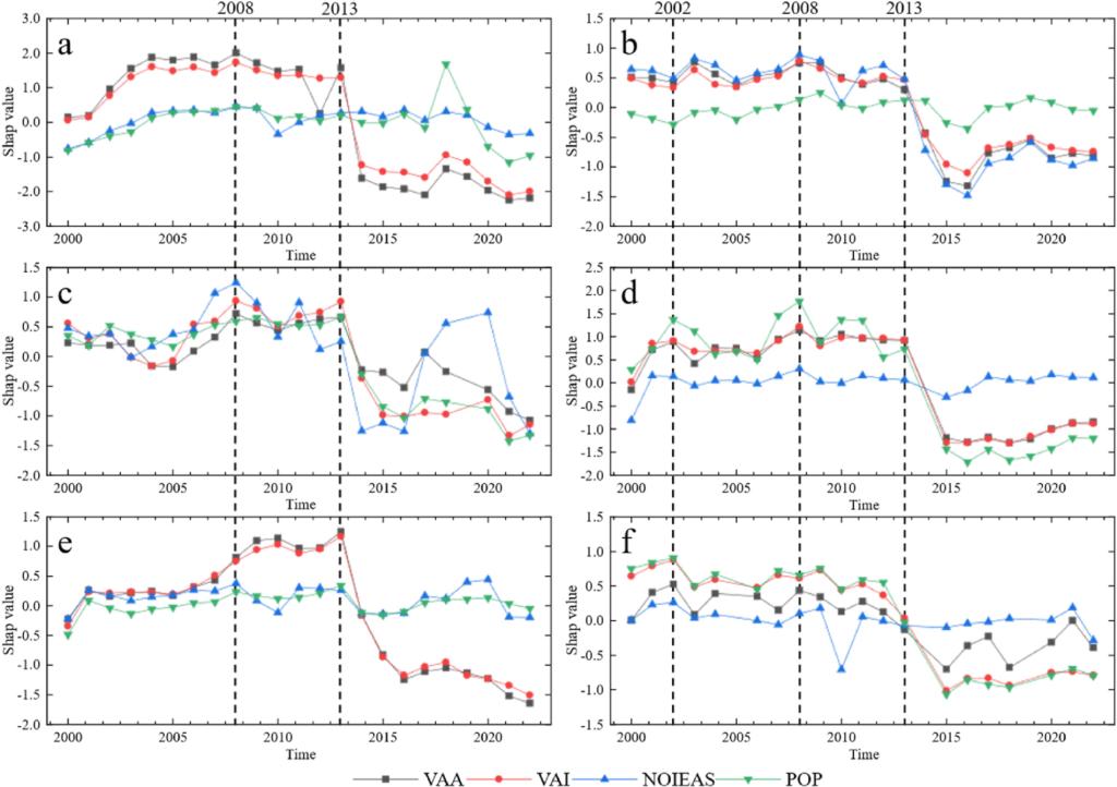 通过对SHAP值的深入分析,揭示了经济发展与湖泊营养化状态间的相关性。第一产业增加值(VAA)和第二产业增加值(VAI)对湖泊水质的影响从2013年的正值转变为2014年的负值,表明两大产业对湖泊营养状况的贡献发生了显著转变。这一变化与中国实施的一系列环保政策密切相关,表明经济增长并没有以水体生态系统的健康为代价。此外,2008年第一产业和第二产业的影响出现峰值,这与中国“十一五”规划应对水环境挑战的关键时期相符。太湖(图5f)自2002年起呈现波动下降趋势,这可能与当年启动的“引江济太”工程有关。该引水工程改善了太湖水环境,抑制了藻类繁殖,对生态系统产生了积极影响。