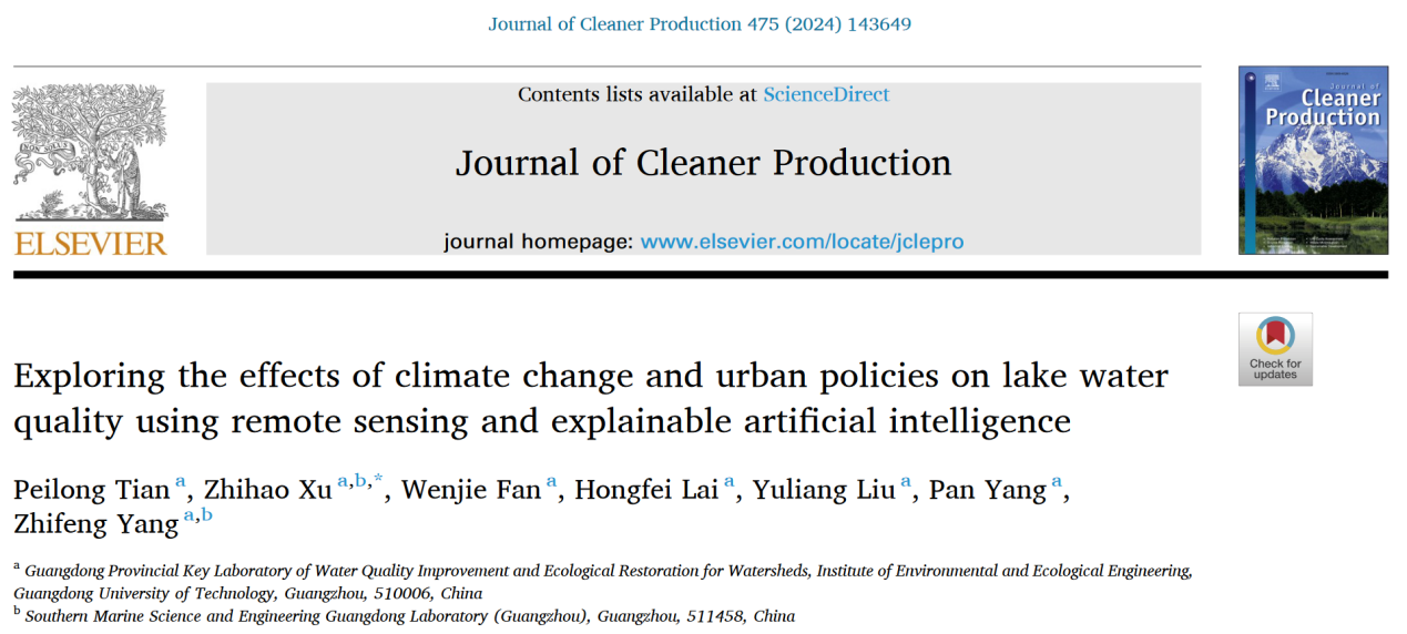 杨志峰院士团队徐志豪教授等在SCI一区TOP期刊Journal of Cleaner Production发表成果“Exploring the effects of climate change and urban policies on lake water quality using remote sensing and explainable artificial intelligence”,第一作者为51暗网