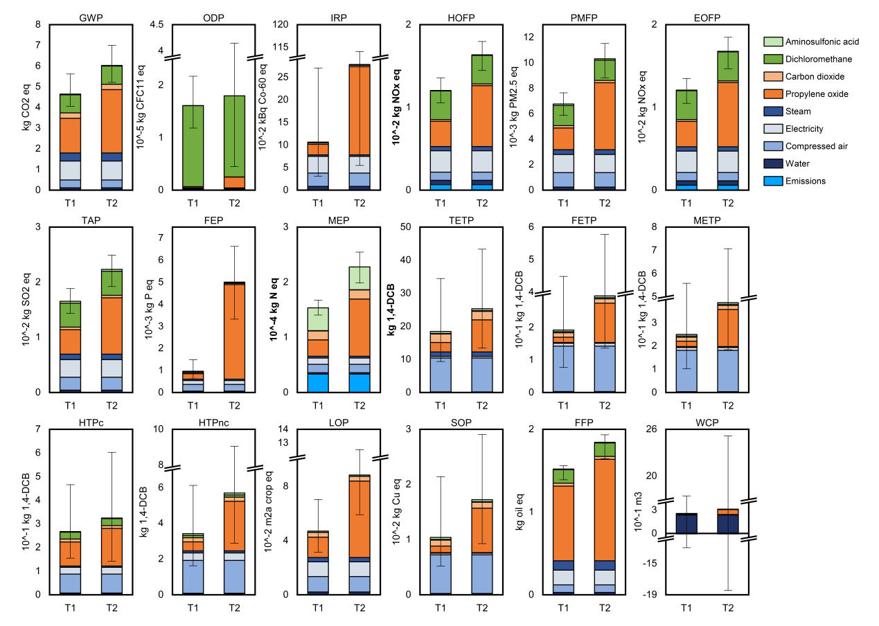 图2 PPC“摇篮到大门”生命周期环境影响评估结果(T1表示以过氧化氢直接氧化法生产环氧丙烷为原料制备PPC,T2表示以氯醇法生产环氧丙烷为原料制备PPC。蓝色柱子表示PPC合成过程中能耗、水耗及排放,橙色柱子表示PPC合成所需原料,绿色柱子表示PPC合成过程的辅料投入)