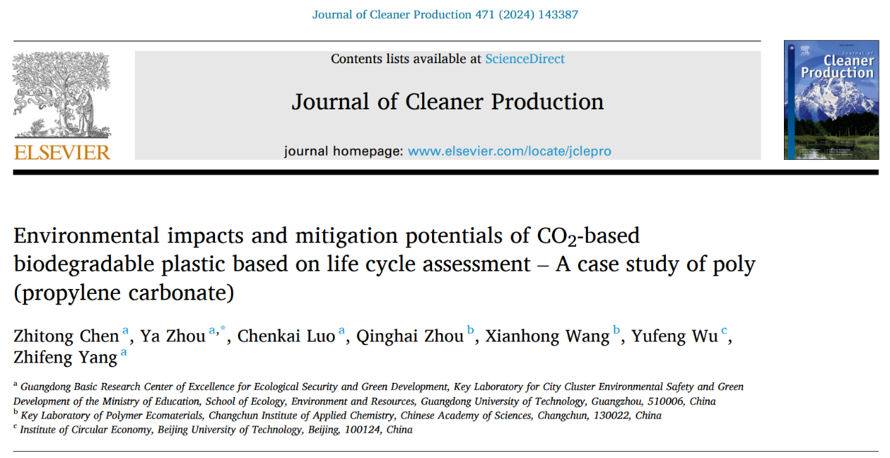 周雅教授课题组在中科院1区TOP期刊《Journal of Cleaner Production》期刊发表题为“Environmental impacts and mitigation potentials of CO2-based biodegradable plastic based on life cycle assessment —— A case study of poly(propylene carbonate)”的研究论文。周雅教授为论文通讯作者,硕士研究生陈致通为论文第一作者,合作单位包括中国科学院长春应用化学研究所、北京工业大学。