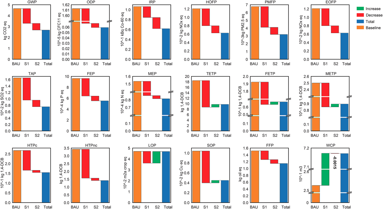 图4 PPC环境影响在技术创新情景(S1)和可再生能源替代情景(S2)的减排潜力(BAU表示基准情景,即采用本体聚合技术生产PPC,HPPO技术生产PO;S1表示技术创新情景,即采用二氧化碳超临界聚合(CSP)技术生产PPC;S2表示可再生能源替代情景,即PPC和PO合成所消耗的电力来自光伏发电;Total指S1和S2综合情景)