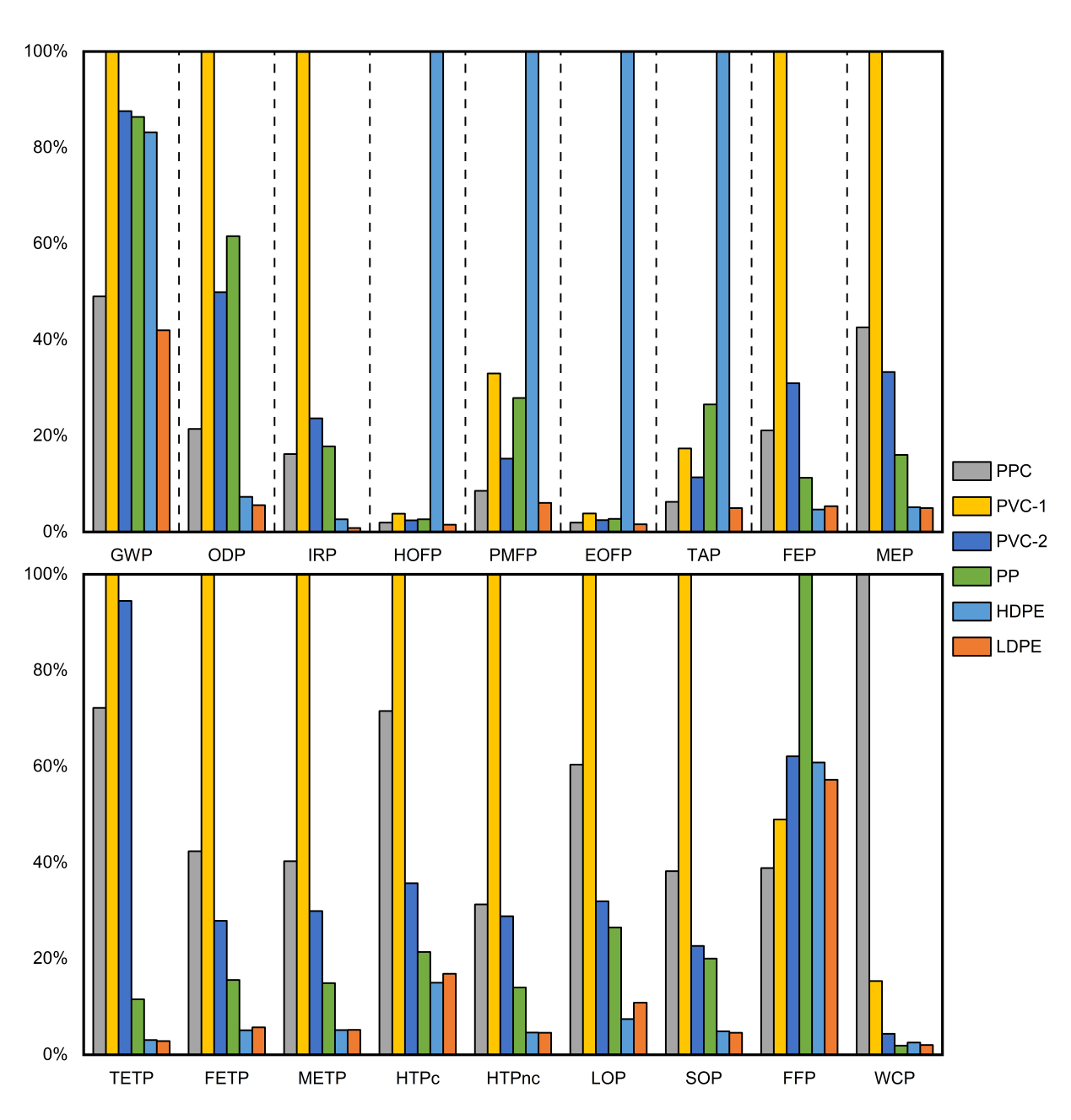 图5 PPC与传统塑料的环境影响比较(PVC-1和PVC-2分别表示通过电石法和乙烯法生产聚氯乙烯)