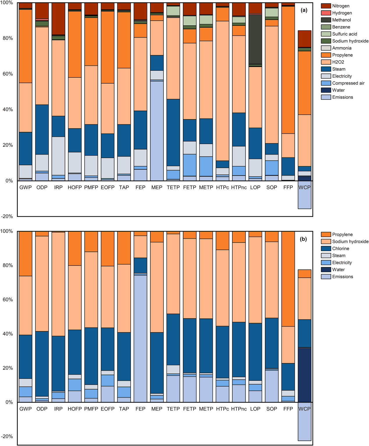 图3过氧化氢直接氧化法(a)和氯醇法 (b)生产PO生命周期环境影响评价结果(蓝色柱子表示PO合成的能耗、水耗及排放,橘色柱子表示PO合成所需原料,绿色柱子表示PO合成中非气体辅料投入;红色表示PO合成中气体辅料投入)