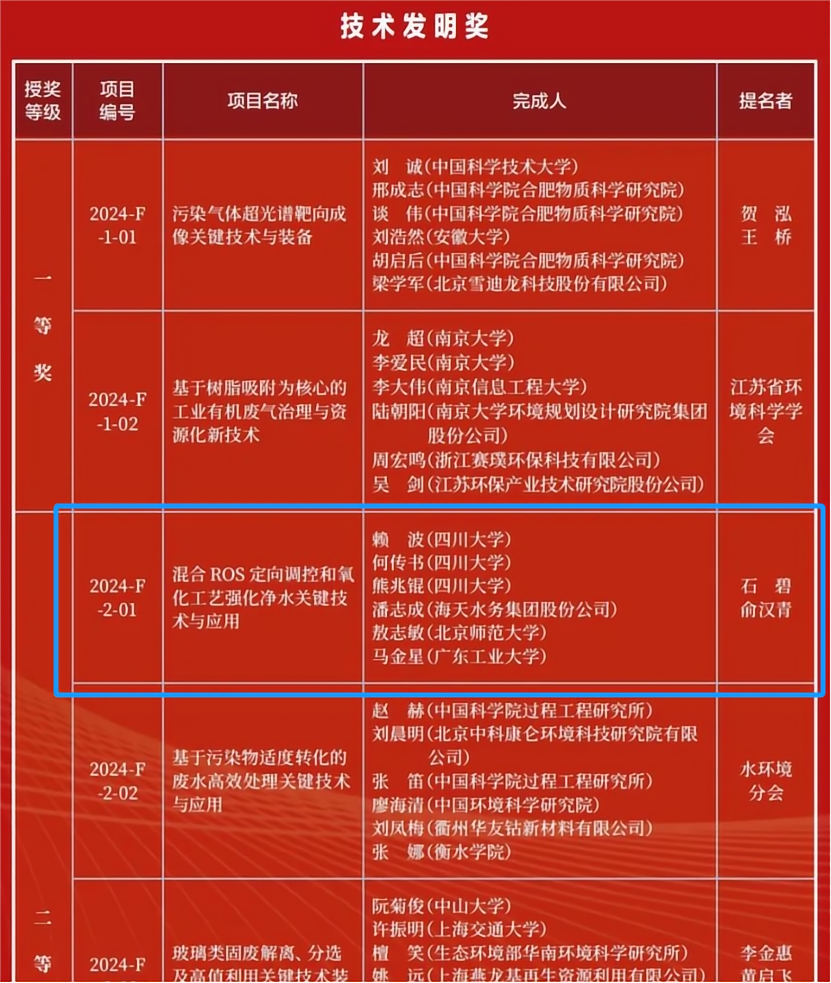 根据《环境保护科学技术奖奖励办法》有关规定,经有关专家、单位提名和专家评审,并通过广泛公示,环境保护科学技术奖奖励委员会共批准71项成果、25位个人、2个团队获2024年度环境保护科学技术奖,其中自然科学奖6项(特等奖空缺、一等奖1项、二等奖5项),技术发明奖7项(特等奖空缺、一等奖2项、二等奖5项),科技进步奖58项(特等奖空缺、一等奖10项、二等奖48项),科技创新奖7项(个人5位、团队2个),青年科学家奖20位。