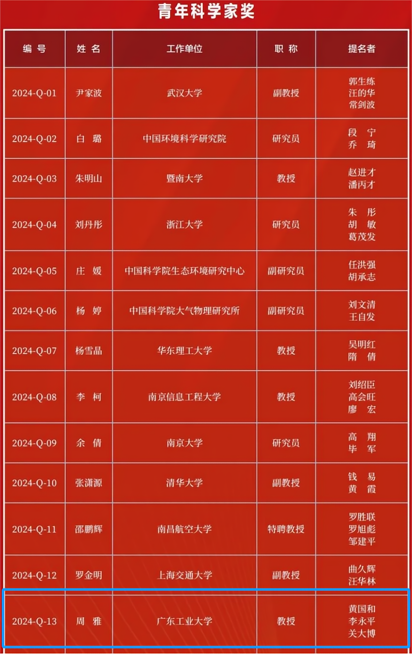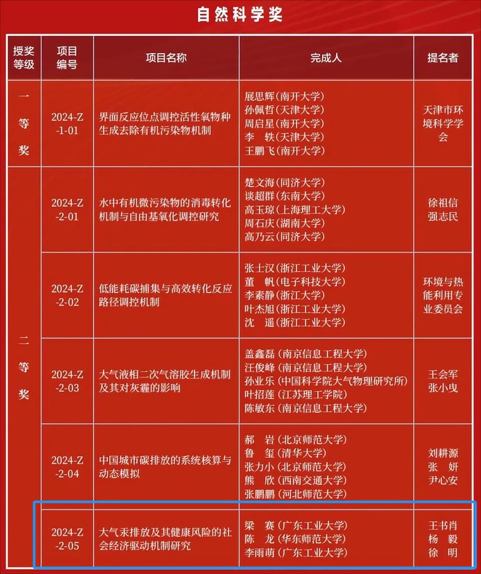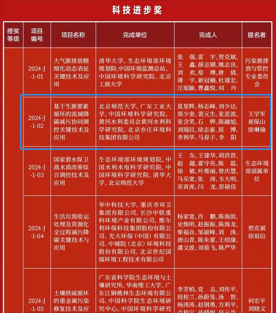杨志峰院士、徐志豪教授、张思波副教授参与的《基于生源要素循环的流域降碳减污协同调控关键技术及应用》项目获科技进步奖一等奖;梁赛教授牵头、李雨萌博士参与的《大气汞排放及其健康风险的社会经济驱动机制研究》项目获自然科学奖二等奖;马金星教授参与的《混合ROS定向调控和氧化工艺强化净水关键技术与应用》项目获技术发明奖二等奖;周雅教授获青年科学家奖!