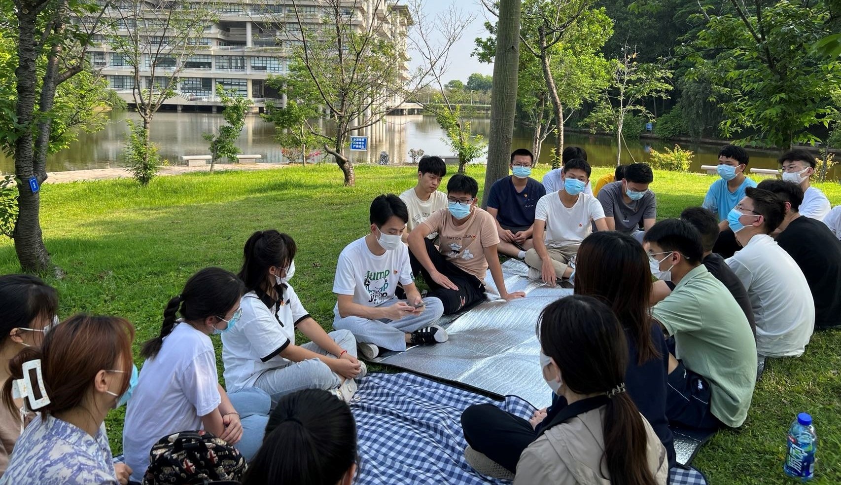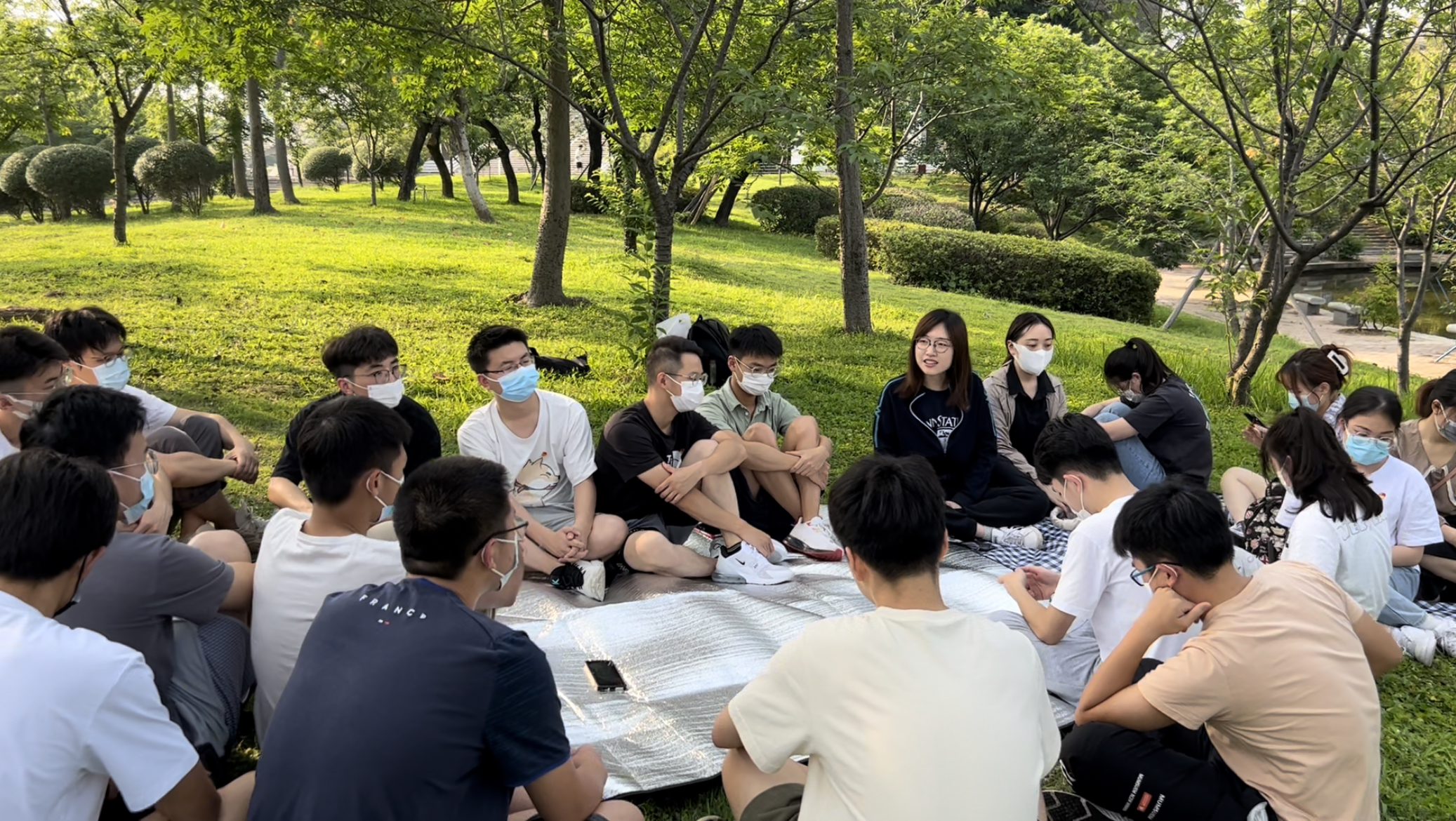 2021级专硕党支部党员携留校本科生团员于教学区湖畔开展“弘扬五四精神,凝聚青春力量”主题“湖畔思享会”活动。活动由党支部书记章莹老师主持。